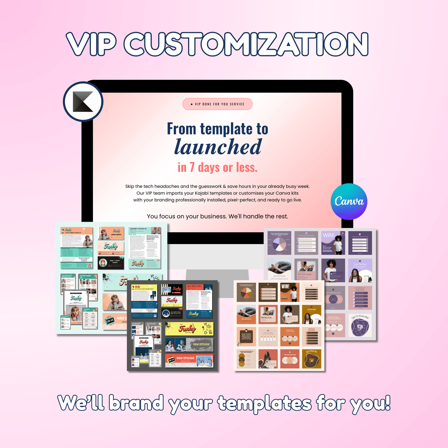 If you prefer to save time in your already busy week, our VIP team imports your Kajabi templates or customizes your Canva kits with your branding professionally installed, pixel-perfect, and ready to go live.