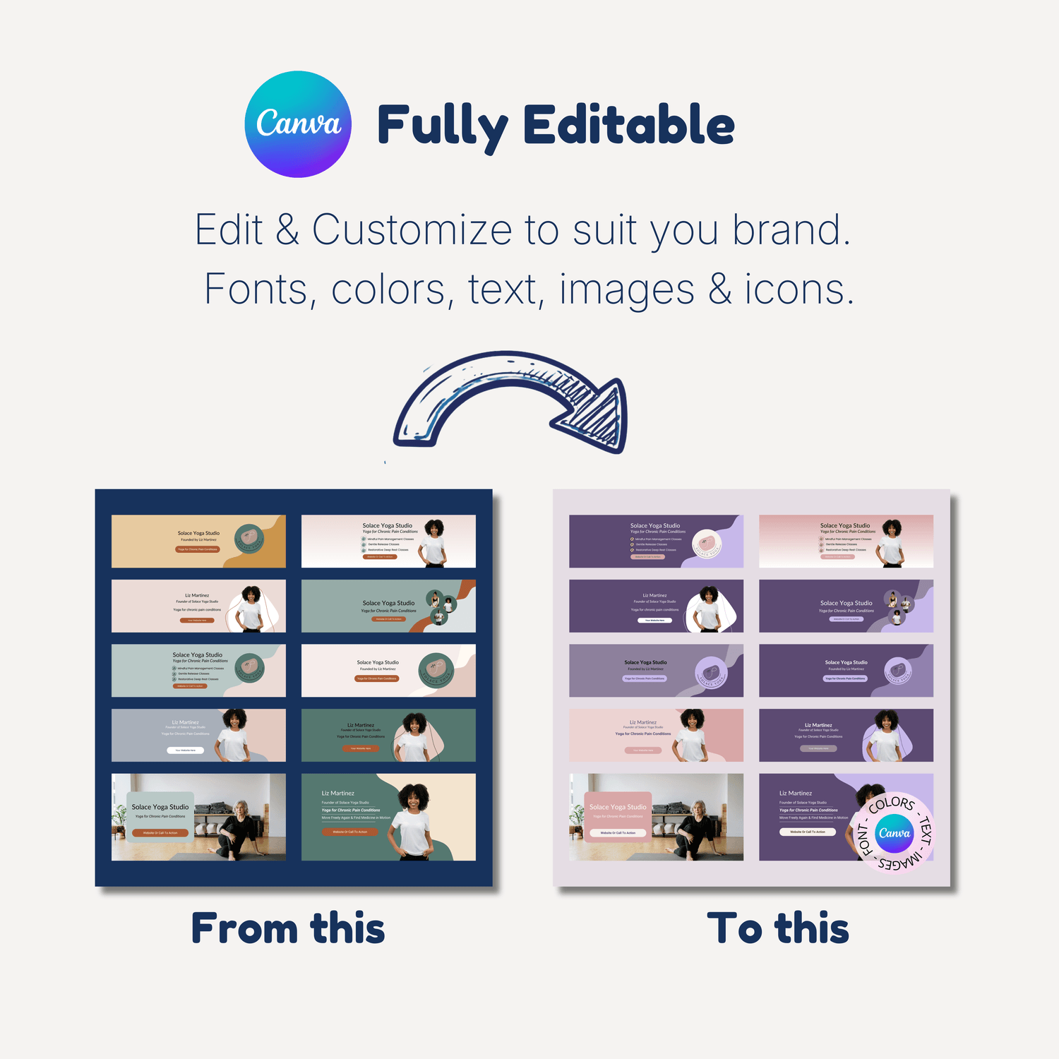 You will also receive the Soft Solace brand kit and a bonus style guide with suggestions on alternative color palettes, fonts and stock imagery best practices.