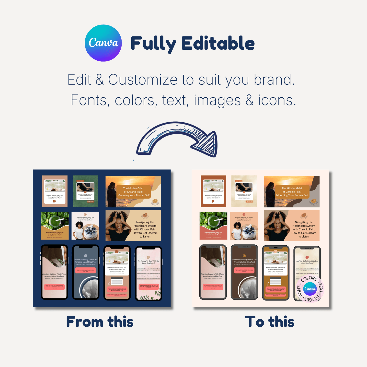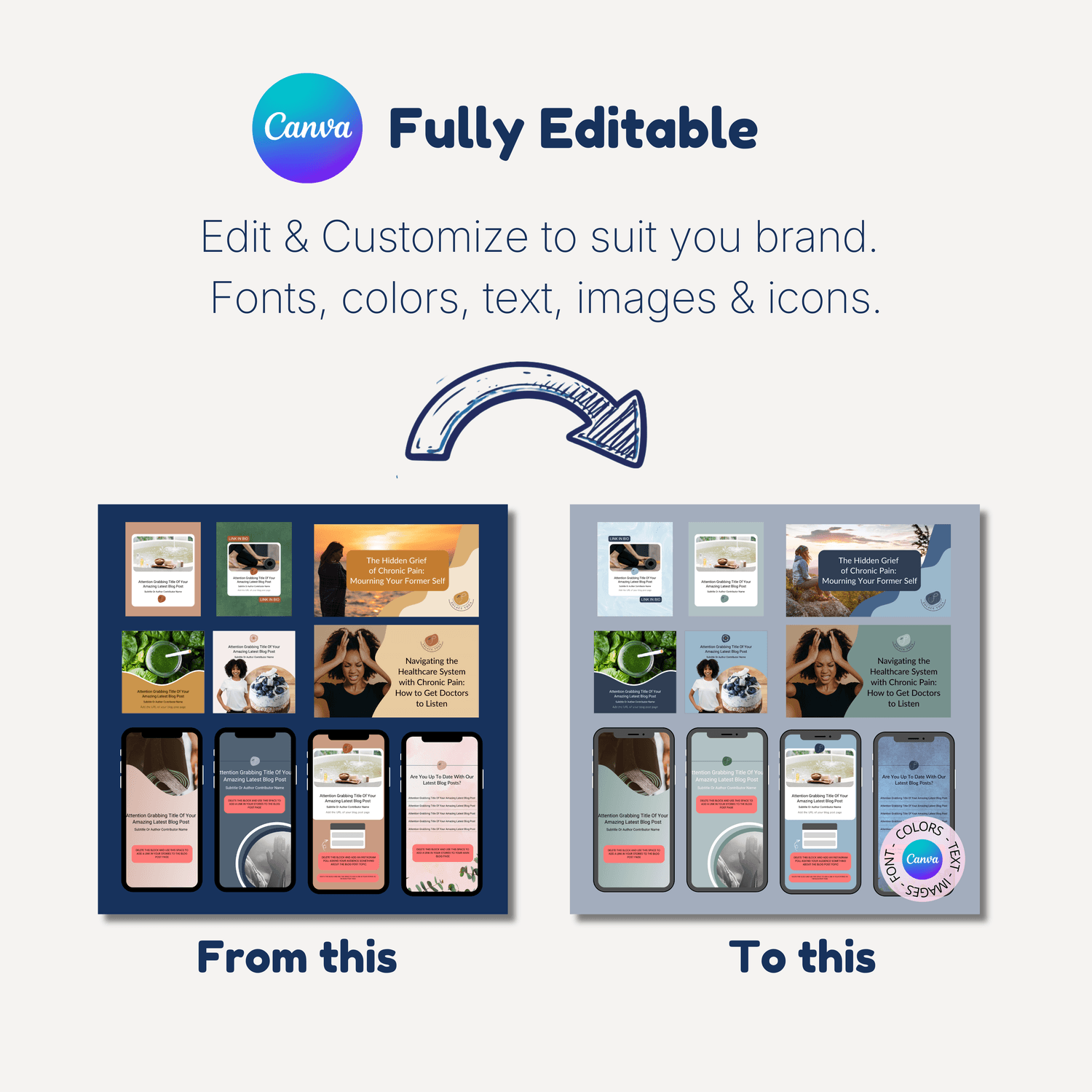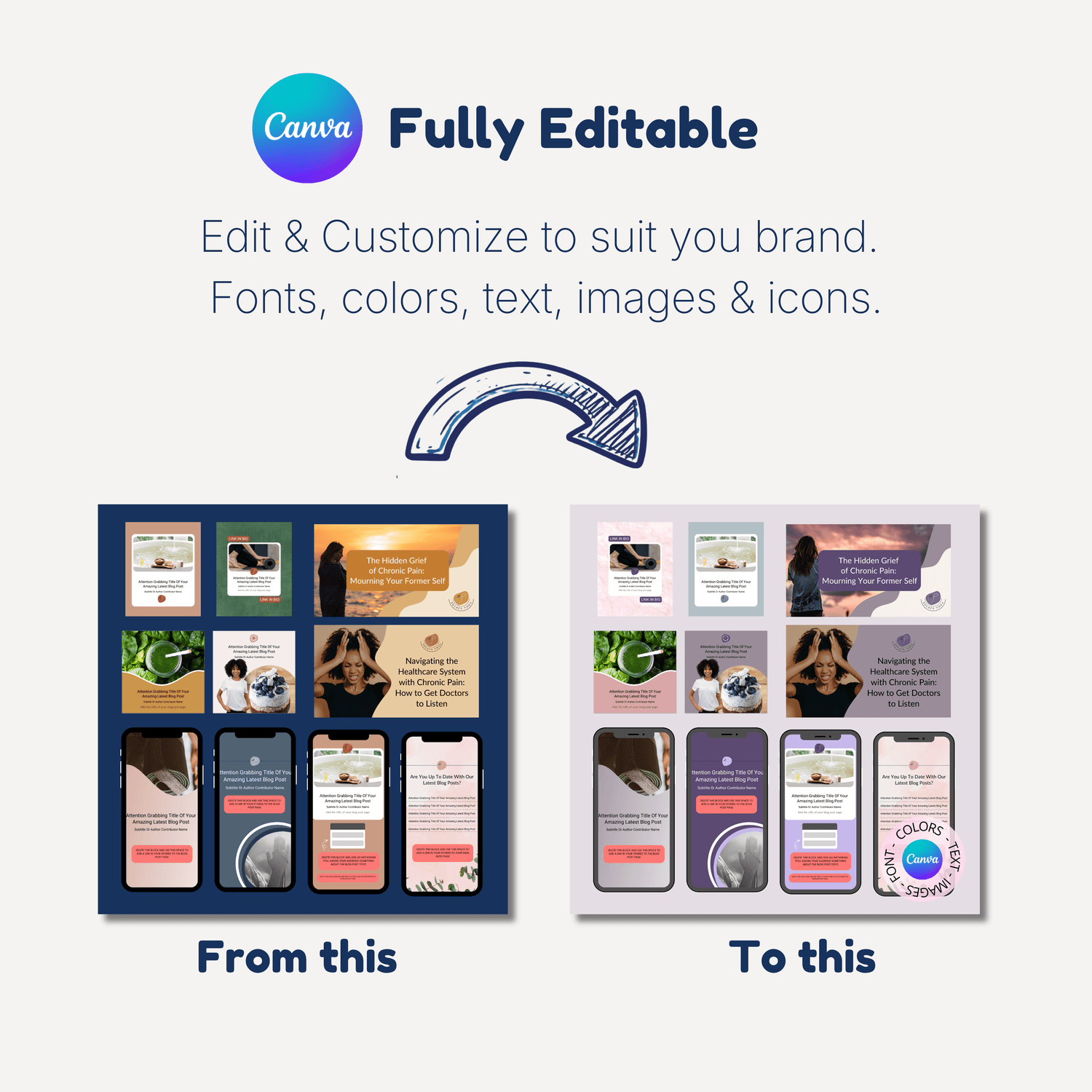 Change colors, text, images, icons and layouts.