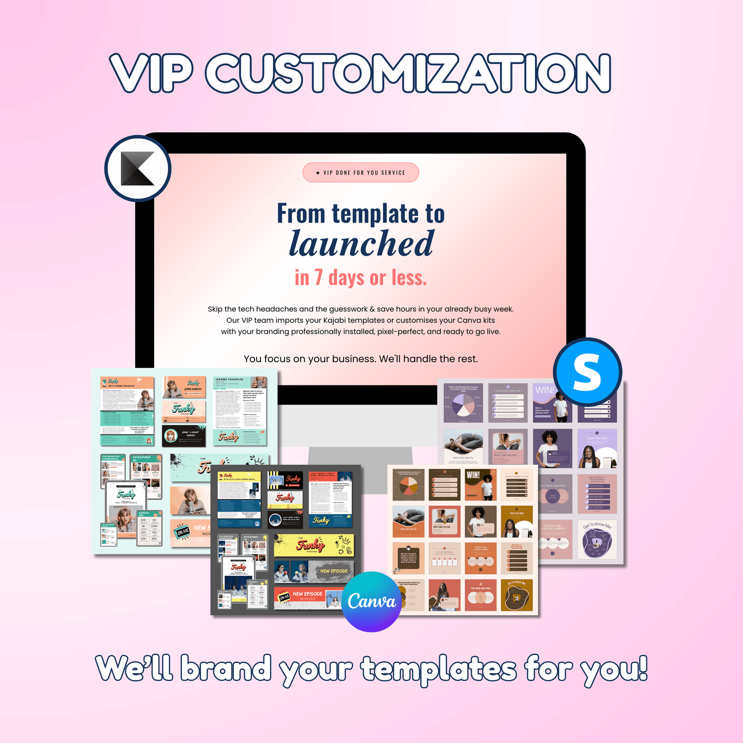 If you prefer to save time in your already busy week, our VIP team imports your Kajabi templates or customizes your Canva kits